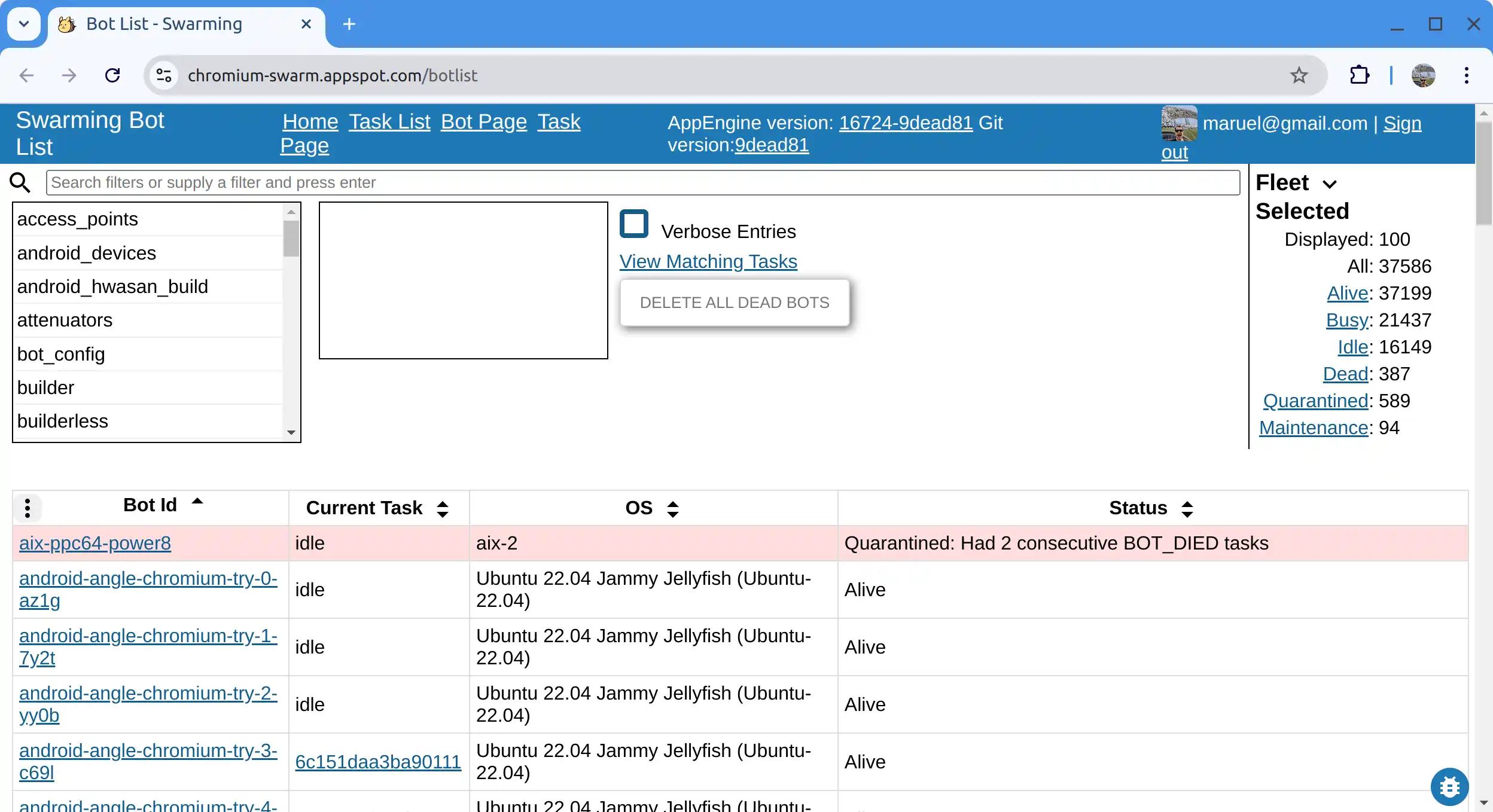 Screenshot of chromium-swarm.appspot.com/botlist