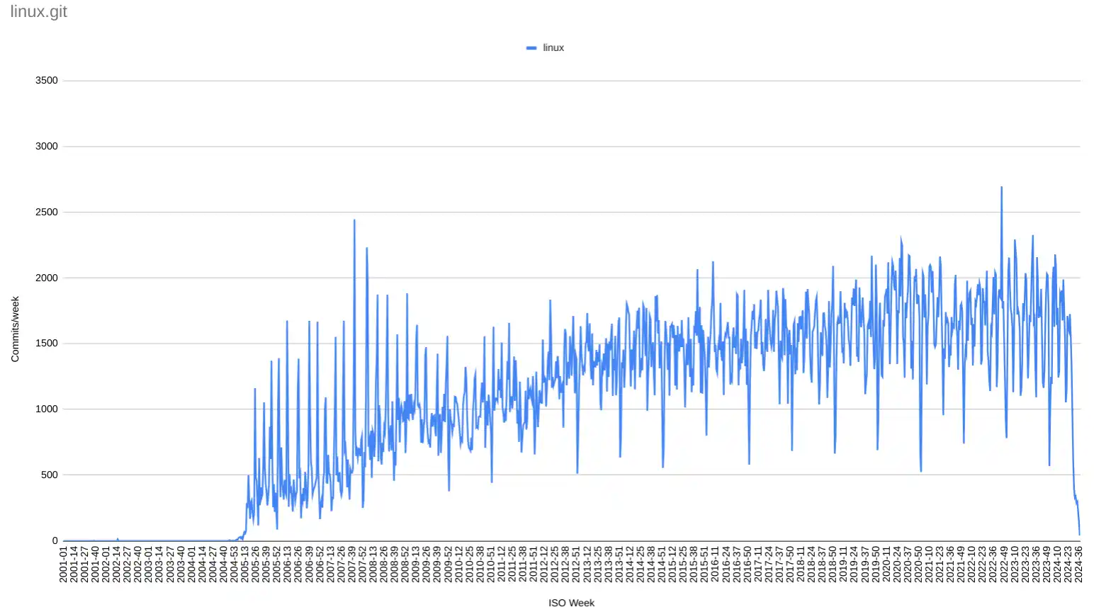 Commits per week in linux.git