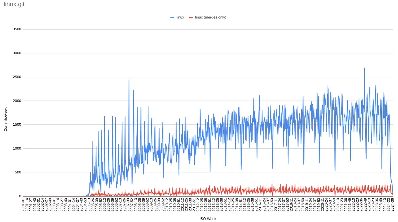 Commits per week in linux.git and merges only