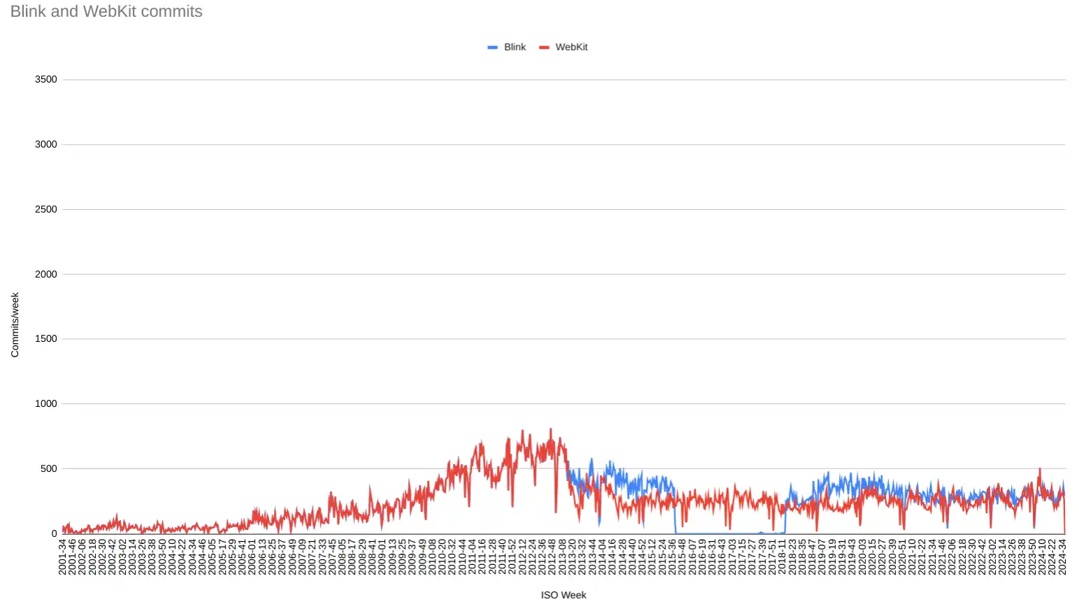 Commits per week in WebKit.git and Blink